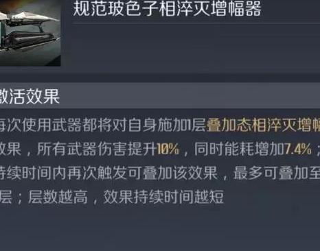 每次使用武器会叠加一层态相淬灭增幅,提升10%武器伤害但增加7.4%能耗,效果可叠加至7层。重复触发能延长并叠加增益,层数越高单次持续时间越短,多层叠加时整体输出显著增强,需合理控制使用频率以平衡能耗与战斗效率。