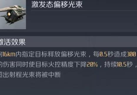 超级装置可在16公里范围内对指定目标发射偏移光束,每0.5秒造成300点伤害,并使其火控精度降低20%,效果持续10.5秒,超出射程则光束中断。