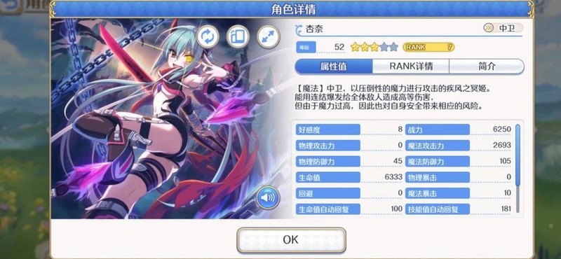 中卫位置首选杏奈,无需多言,当前仅有她一名三星角色值得推荐。52级Rank7满强化装备搭配8级好感,魔法攻击力高达2693。技能可释放巨额全体魔法伤害,但会令自身双抗归零。当生命低于10%时,会对周围敌人施加较强魔法伤害,可惜通常此时她也即将退场。整体输出能力极为强劲,爆发惊人。