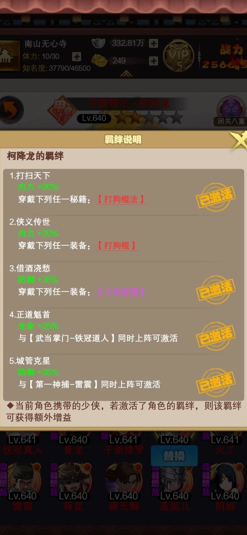 我的雷震输出其实相当可观,依靠八星雷震、穴位谱和红手套的搭配。放在三号位时,柯降龙的辅助作用有限。星级越高似乎连击率也更高,不过尚未深入研究,不敢妄下定论。因此搭配修罗,以防她释放万花时无法衔接,让老柯能及时支援。