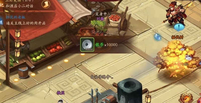 沿着指引前进即可,无需多想,任务引导十分清晰。跳过剧情快速推进,途中留意路边的摇钱树,经过时点击一下,会有物品掉落。