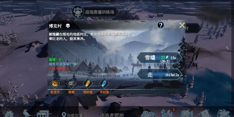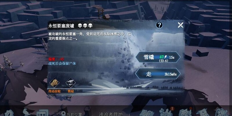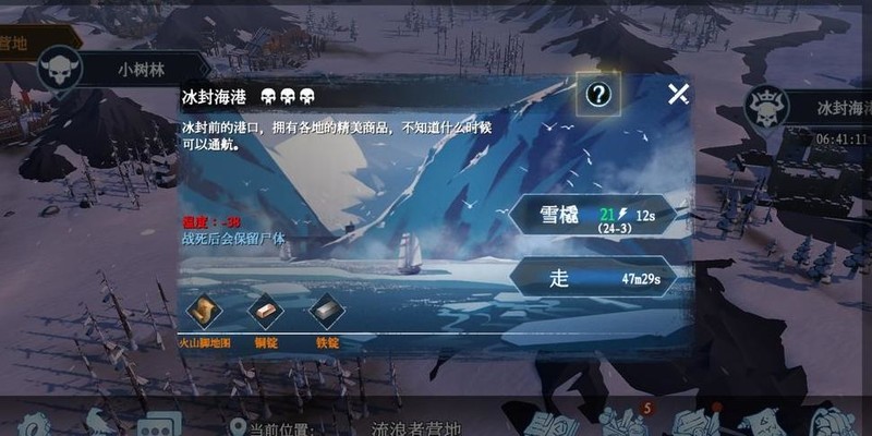 游戏地图包含资源、限时副本、限时事件和功能四类,每张地图均有温度要求。若角色温度低于标准,保暖值将按差额递减,归零后每轮损失6点生命。