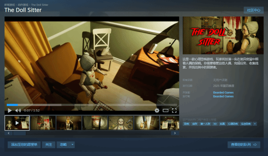 一款由Bearded Games开发的第一人称心理恐怖游戏The Doll Sitter已正式公开,目前游戏页面已在Steam平台上线,预计于2025年第四季度发布。
