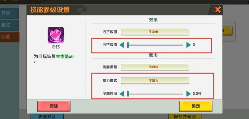 进入技能参数界面,将治疗值设为零,选择无蓄力模式,并将冷却时间调整为零秒。