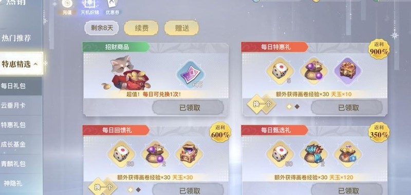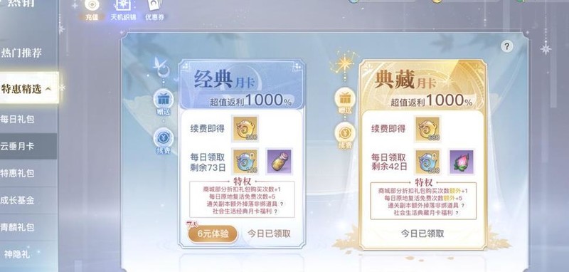长期游玩的话,月卡几乎是必备选择,充值后可立即获得300天玉和680天谕。许多开服近两年的区服中,不少玩家账号仍剩余近一年的月卡时间。