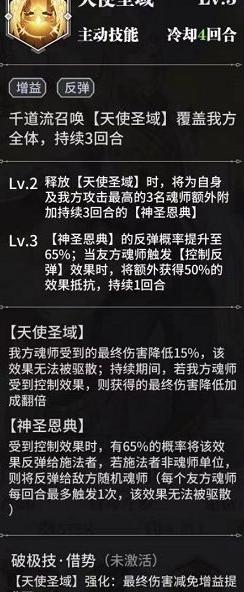 一星和二星时强化被动,显著提升保护队友的能力,且超出部分的伤害不再由千道流承担。三星后,千道流在天使领域存在期间自动获得名刀效果,免疫致命伤害,并回复30%生命值;若领域消失,则重新释放,进一步增强自身生存与防护能力。