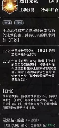 千道流二技能开局第二回合释放,冷却两回合,持续两回合。具备减伤与抗暴效果,队友攻击可为其回血。日蚀视同灼烧,契合火系阵容。灼烧、中毒、撕裂无法被驱散,大幅提升火队整体实力。
