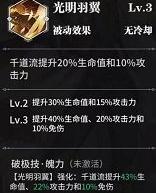 技能3「光明羽翼」:生命值提升40%,攻击力增加20%,并获得10%伤害减免。