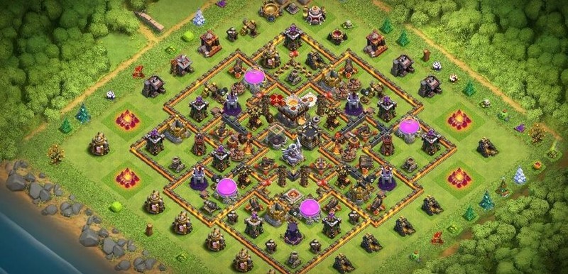 第三种阵型采用多层引导结构,由内至外可依围墙划分为四层。最外层围墙并未完全闭合,留有多个间隙,这种设计能有效干扰炸弹人进攻路线,防止敌军从薄弱角落突入核心区域。内部围墙呈回字形封闭布局,形成强效引导路径,一旦敌军部队被引入循环路线,便会持续暴露在内层防御建筑的集火攻击下,战斗力迅速削弱。针对高本玩家常用的天女战术,外围间隙处布设了大量巨型炸弹与空中地雷,能显著消耗天使血量,使其在战斗初期便遭受重创,进而大幅降低天女组合的推进效率。防空体系方面,防空火箭分布于四角,虽略微稀释了火力密度,但能有效分割敌方飞龙与狂暴法术的配合,尤其对雷电飞龙流派具备出色的牵制与消耗能力,整体布局兼顾引导、陷阱与防空均衡性。