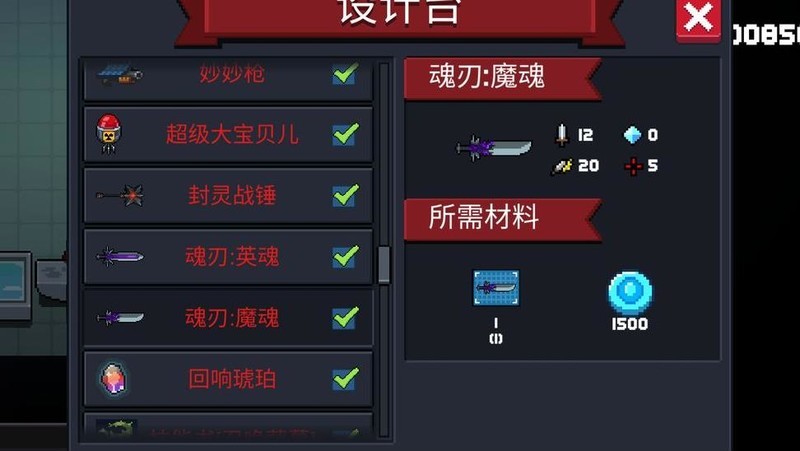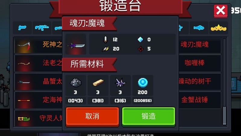 攻击方式包含普通斩击与蓄力投掷。普通状态下每次造成12点伤害,攻击速度快。蓄力完成后将武器投出:英魂形态呈直线飞行,基础伤害为12,每击杀一名敌人,短时间内伤害递增1点,最高叠加至18;魔魂形态则沿曲线旋转前进,造成20点伤害,并有一定几率触发冰冻效果(界面显示为暴击字样,但实际不依赖暴击机制)。武器飞行一段时间后自动返回手中,途中可清除敌方弹幕。若具备近战反弹天赋,可将敌方弹幕反向弹开;若拥有蓄力加快天赋,则能显著缩短蓄力时间。