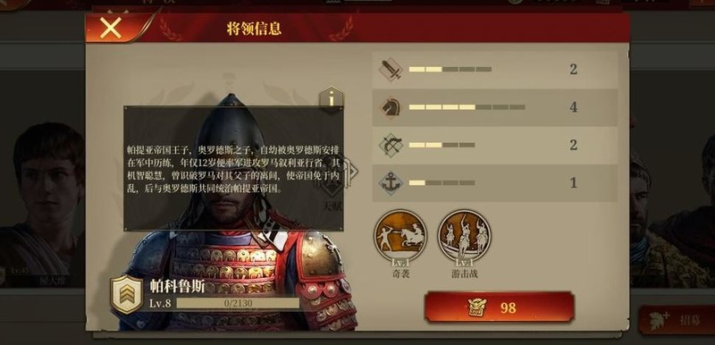 对于新手玩家而言,初期选择合适的将领有助于快速度过前期阶段。若是非氪金用户,建议优先获取勋章商店中售价98的铜卡将领帕科鲁斯,因其性价比高,玩家们通常习惯称其为98。