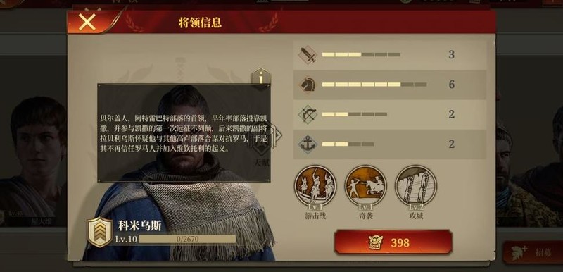 非氪金玩家推荐阵容:贝利撒留与98(后期可换为科米乌斯398)、庞培与维钦托利、米特拉达梯搭配德鲁苏斯,兼顾输出与生存,适合长期发展。