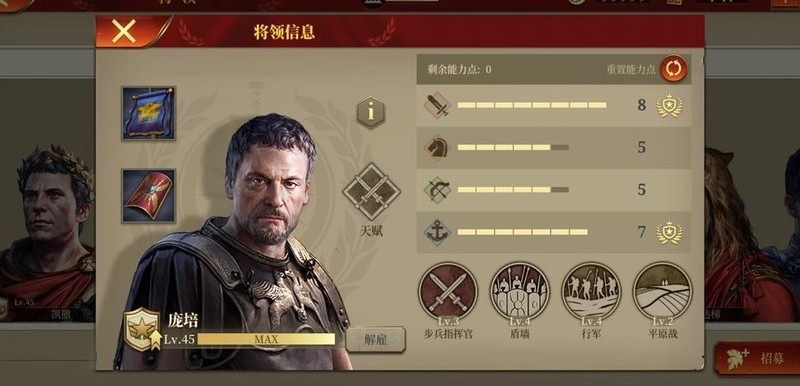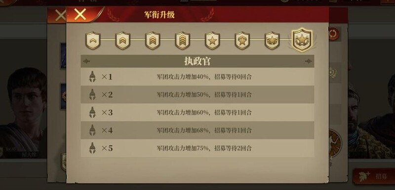 指挥官晋升路径:队长起步,依次升为军士长(30勋章)、百夫长(55)、千夫长(90)、军团长(150)、将军(245)、元帅(380),最终成为执政官(575勋章)。