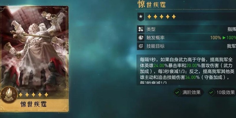 武力高时大幅提升全队暴击率与普攻伤害,暴击加成优于破敌和狂烈;守备高时则增强主动技与追击伤害。技能适用广泛,全面覆盖暴击、主动、追击三大主流阵容体系,兼容性强,战术价值极高。