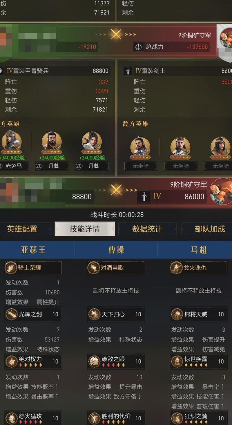 该阵容与无双骑战斗用时相同,均为28秒,但因缺乏回复能力,战损略高,建议提升红度后再考虑使用此阵容。