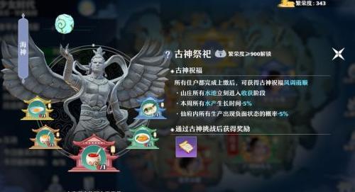当山庄繁荣度达到900时,将开启古神祭祀功能。所有道友提交指定道具后,便可发起古神挑战,成功即可获得当周古神祝福。每周祝福随机刷新,共五种类型,分别可使田圃、牧场、树盆、花圃或水池中的作物瞬间成熟,立即收获。