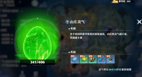 当山庄繁荣度达300时,开启灵气玩法。每日可采集一次灵气,有机会获得阵法、鲜花等奖励。