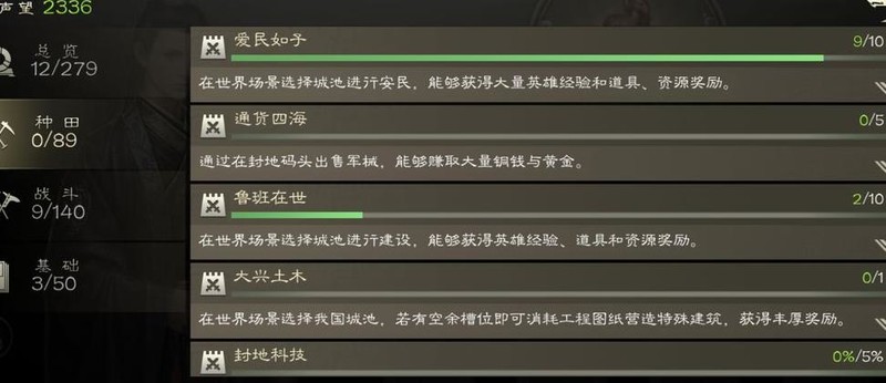 种田类成就侧重内政发展,涵盖城池建造、民生安定、科技提升及商贸往来等方面。
