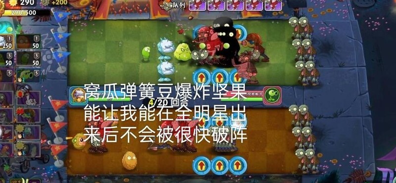 游戏启动后,先种植一株冰龙草和一颗坚果,紧接着迅速点击左下角的三个僵尸增益图标。随后持续点击读书人图标,直到其达到上限(注意:满级后图标会变灰,短暂冷却后可再次使用;此时可暂缓点击,优先在第三排补种一株冰龙草,之后再继续升级僵尸)。过程中只要有空位就补上坚果,能升级的植物尽量升至满级,冰龙草视情况适当补充。一旦解锁三阶植物,需立即投入战场,合理布置弹簧豆与窝瓜,位置可灵活选择在坚果前方或后方。当进入全明星阶段后,应快速连续点击加号,大量补充各类植物以增强战力。整个流程可参考后续视频演示——尽管操作中存在不少失误,部分动作因刻意展示而未能完成,视频中也会有相应提示。虽然过程不够完美,但三阶植物带来的优势极大延缓了压力,在关键阶段提供了充足的应对时间,最终成功通关。