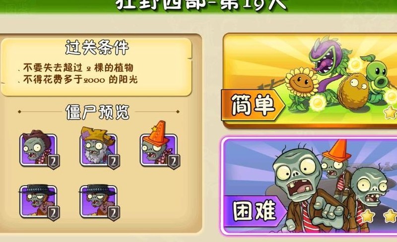 欢迎来到植物大战僵尸2狂野西部第19关困难模式!本关挑战升级:限损2株植物、阳光上限2000,且无小推车护航。面对牛仔僵尸、淘金者等敌人,如何巧妙布阵?小布带你详解植物搭配与防守策略,轻松通关!