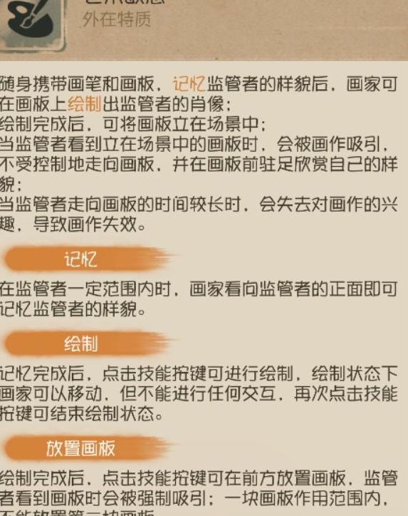 画家在对局中以破译密码机为核心,通过布置画板协助队友牵制监管者,同时分担伤害,为团队创造安全的破译环境。