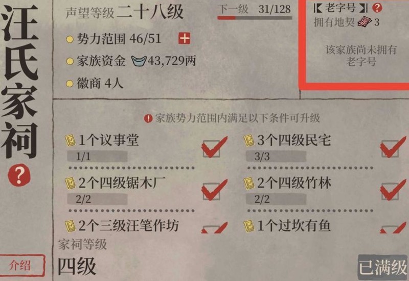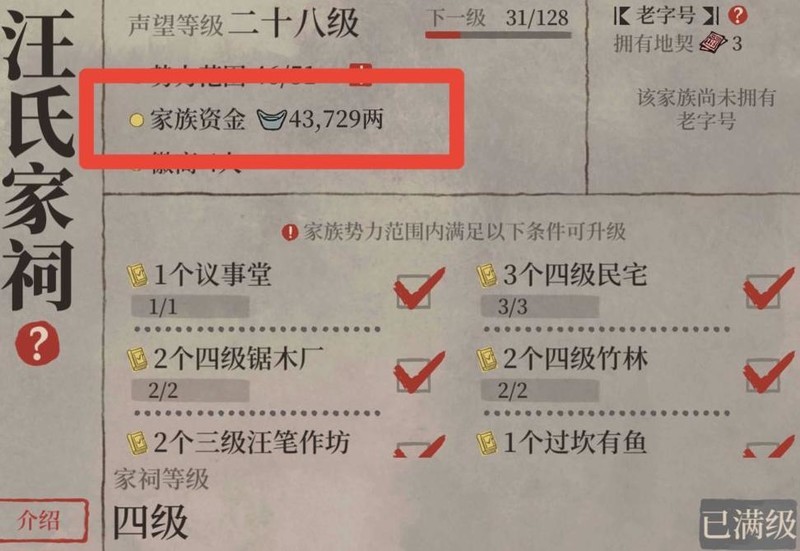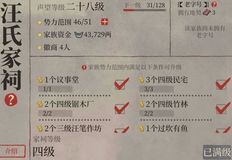 升级四级家祠所需势力广、家族资金高达12万,耗费巨大,因此暂无升级必要。