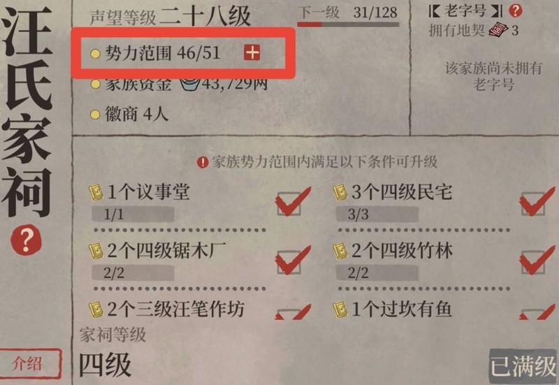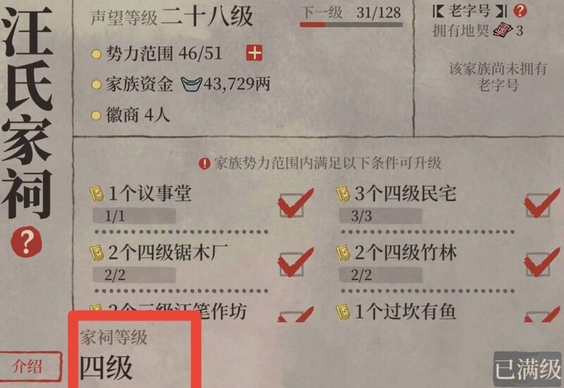 家祠最高等级为四级,需在势力范围内建造指定建筑方可升级。