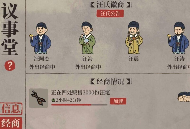在议事堂可查看徽商人数、空闲状态及经商详情,点击加速消耗问政山笋缩短经商时长。当资源充足且急需铜钱时,派遣徽商经商并使用山笋加速,能快速获得大量铜钱,此方式效率远超商栈。