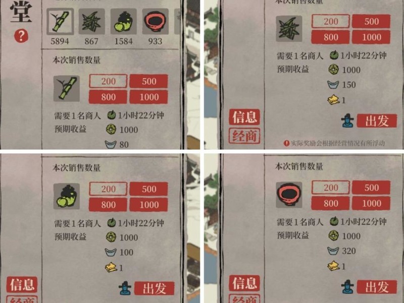第三步是生产资源,应优先选择销量最高的销售方式,迅速回笼资金进入下一轮生产。若能掌握自身的生产节奏,按节奏推进效果更佳。通过持续循环生产和销售,逐步实现该资源的市场垄断,最终解锁笔墨纸砚的售卖权限,为后续经营奠定基础。