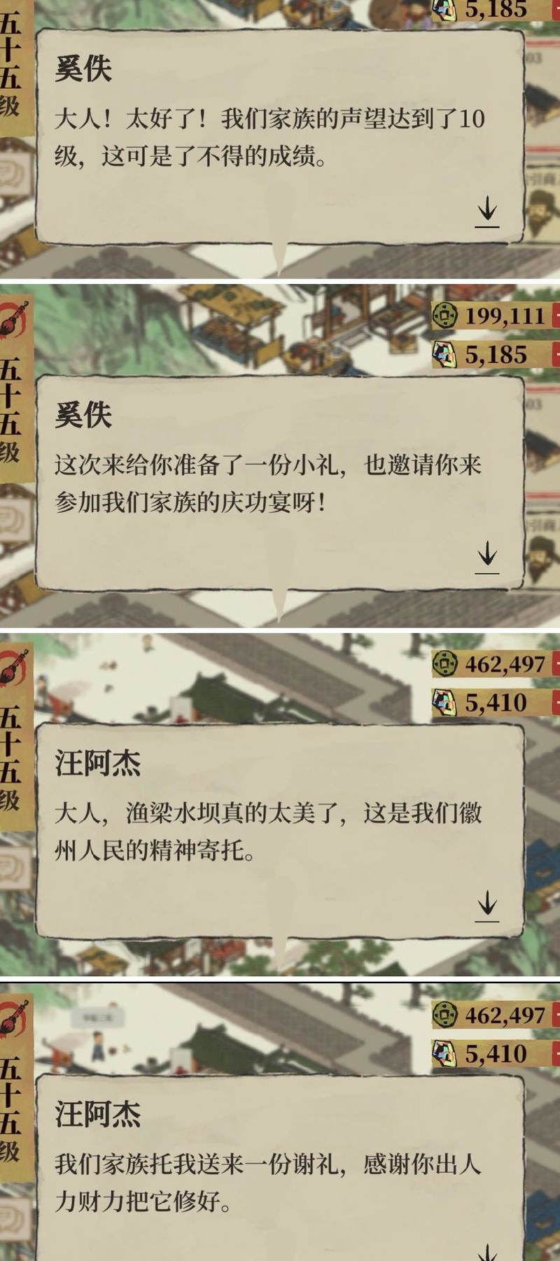 声望通过徽商经商获得,每次经商返回后可随机增加一定声望。当声望累积至特定数值时,声望等级自动提升,机制类似于经验条:家祠积累经验,达到升级阈值后即完成进阶。