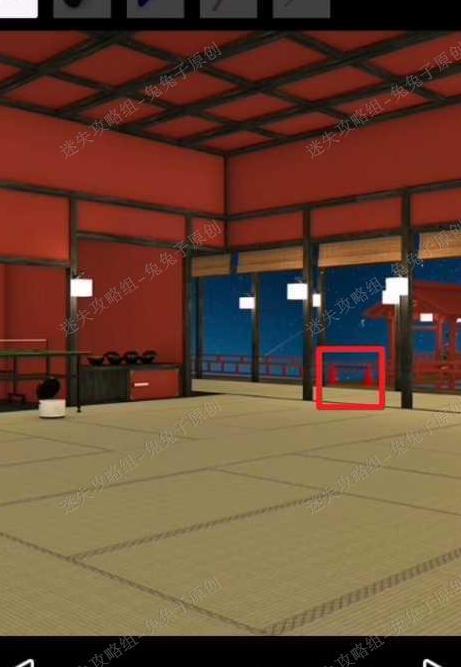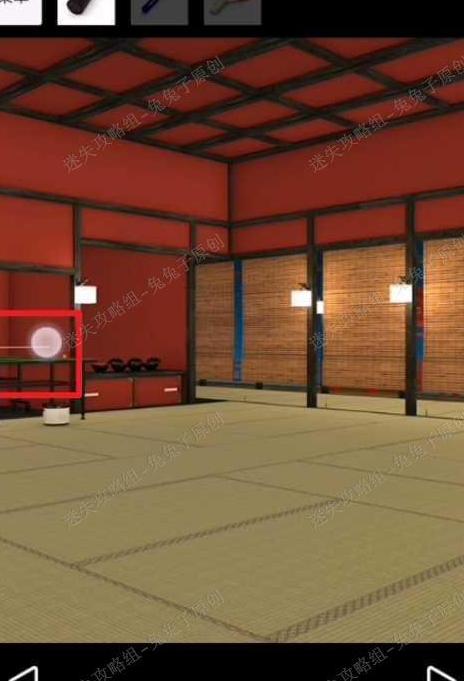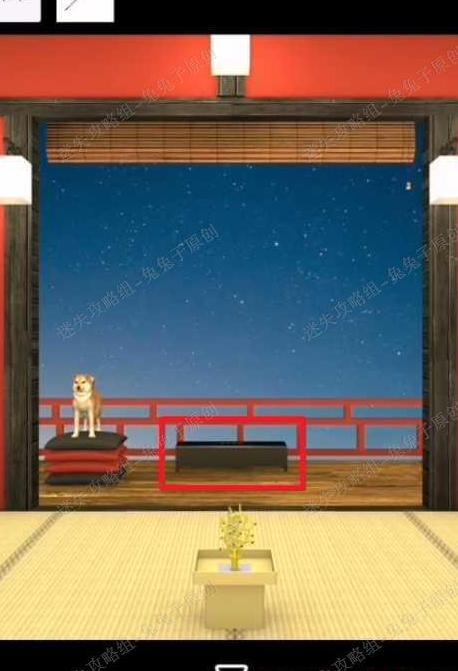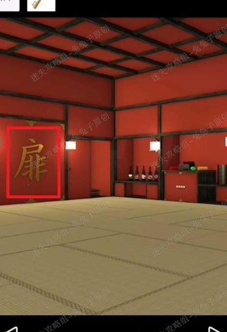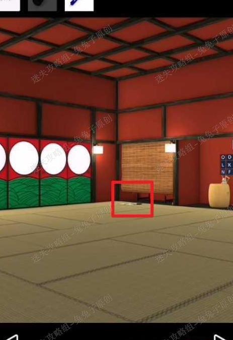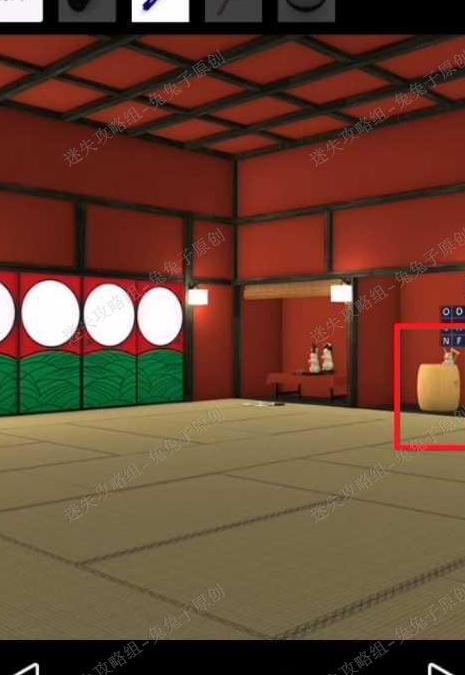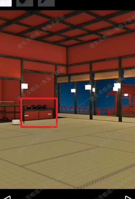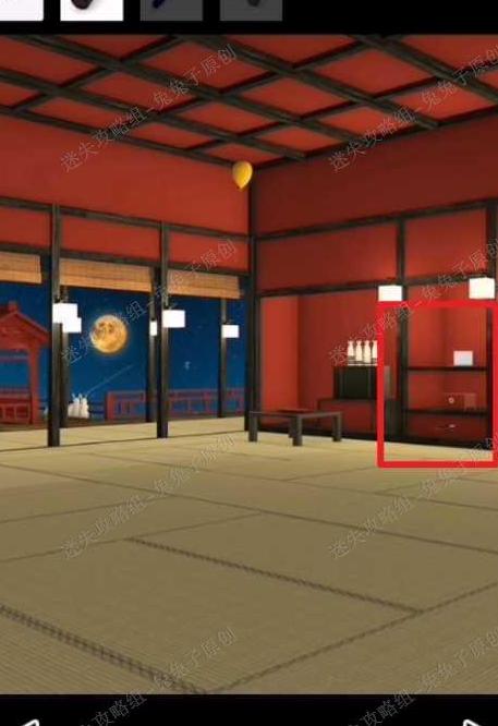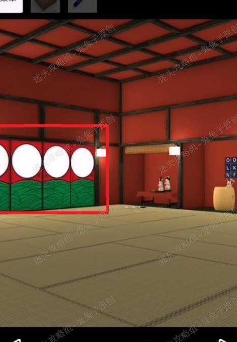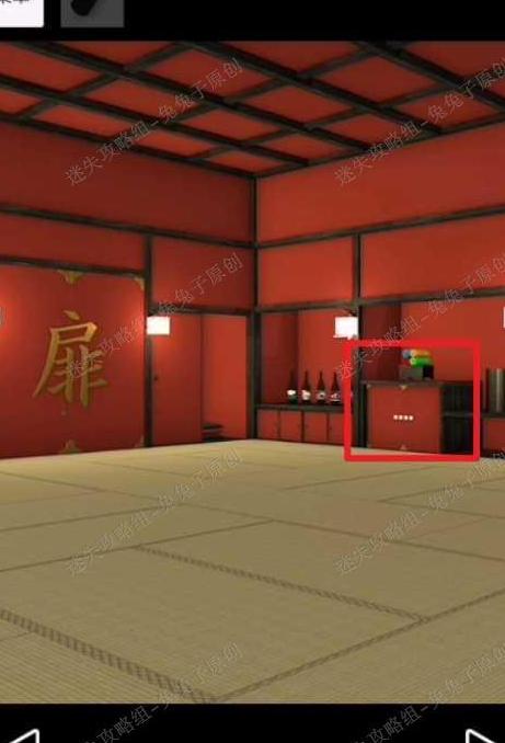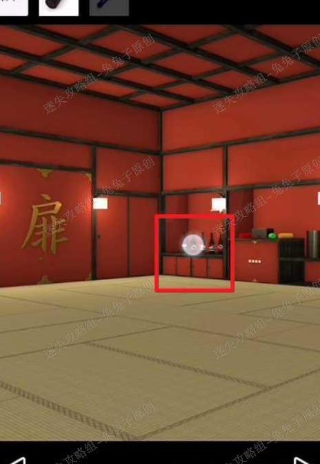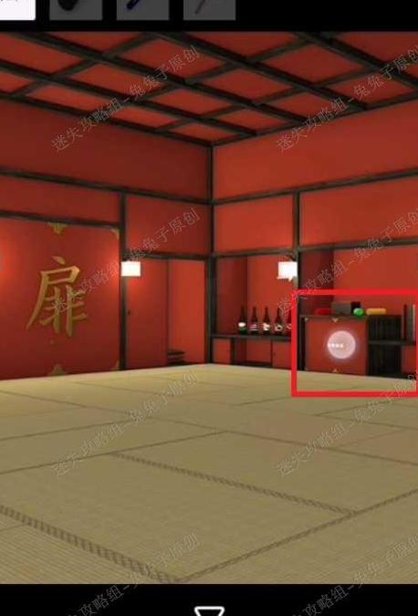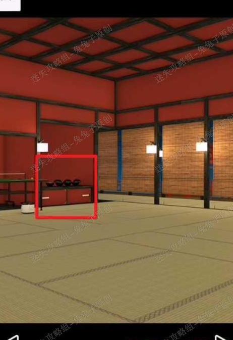 将场景向左移动,点击柜子进入放大画面,再点右侧柜体,根据木屐上箭头的提示顺序调整按钮,从左到右依次为:下、上、下、下、上。设置完成后退回上一画面,点击柜子即可开启,取出其中的蒲扇即可。