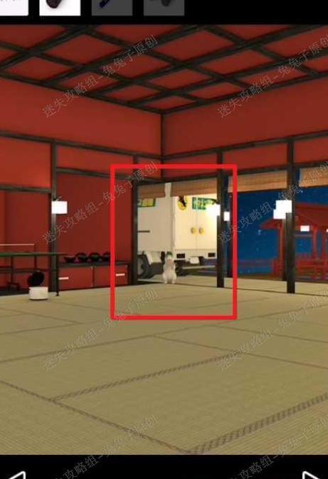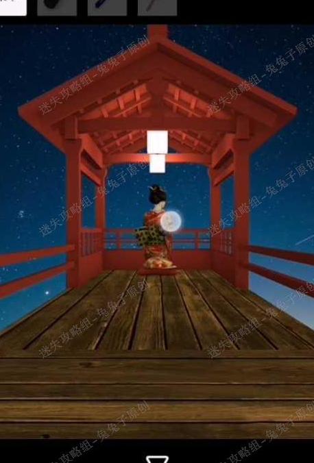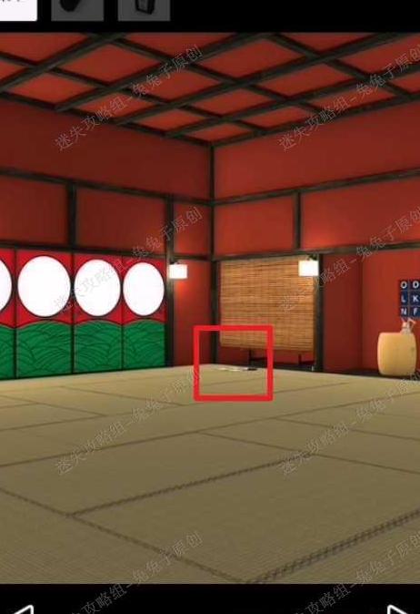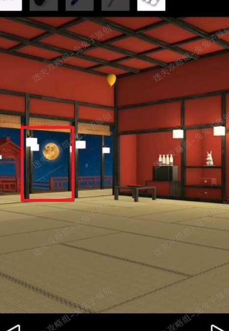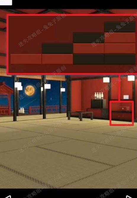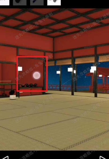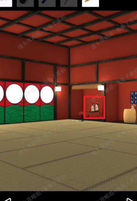 返回之前倾倒墨汁的位置,此处摆放着四块纸板,分别位于左上、右上、左下和右下四个方位,颜色依次为红、黄、绿、蓝。点击纸板可输入文字,再次点击则更换文字内容。将左上红色纸板设为姬,右上黄色设为兔,左下绿色设为月,右下蓝色设为翁。设置完毕后退回前一场景,掀开前方帘子,发现内有两尊兔子雕像,暂不处理,继续后续操作。