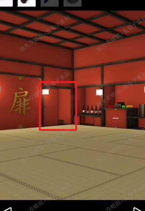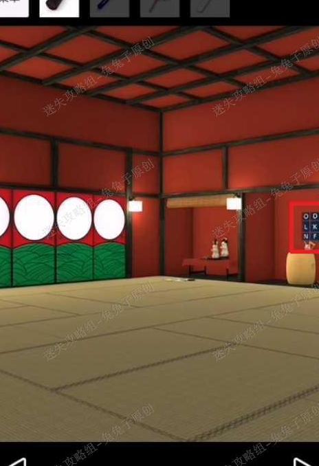 进入带有扉字的大门场景后,点击右侧的大型柜子以放大视角。接着点击柜子上的盒子,盒面有六个按钮。将未按下的状态记为上,按下则为下。按照从左到右下上下下上上的顺序操作,即按下第1、3、4个按钮。完成后退出当前画面,再次点击盒子将其开启,取出其中的螺丝刀即可。