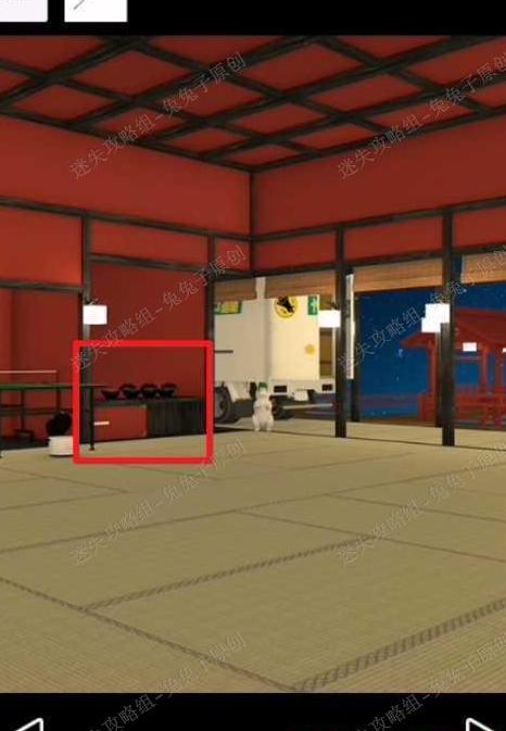 将场景向右拖动,点击图示位置放大画面,再打开左侧的门。门内有一部电话机,投入硬币后触发小游戏。游戏内容简单:当右侧兔子移开手时,迅速点击屏幕进行捣年糕操作,连续成功十次即可完成。完成后,取走投币机下方的墨汁。物品编号为3X1。