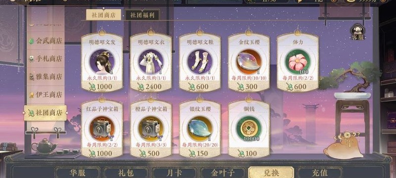 社团贡献可兑换整套服饰、红金装备及各类材料,建议优先换取高品质四艺装备,服饰可根据需求逐步积累兑换。