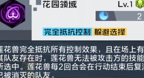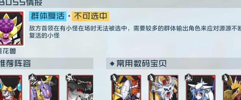 当BOSS在场且有队友时,受花园领域效果影响,无法被进攻技能选中,需搭配具有范围攻击能力的数码兽来清除周围小怪以创造输出机会。