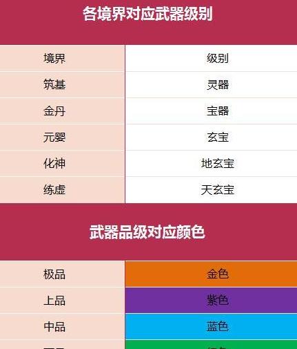 武器有不同品级和等级境界,下附清晰对照表,一看便知。