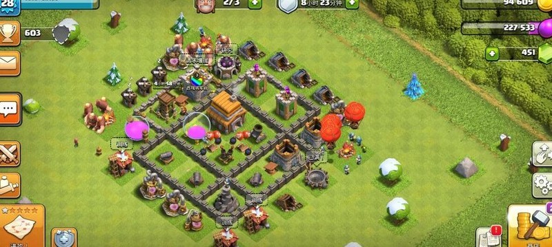 由于我目前圣水和金币比较紧张,又偏爱种田和购物类玩法,所以把关键资源放在中间区域。大家若需升级或购买旗帜,可自行放置金库或圣水瓶。我仅有一只火箭筒,因气球兵威胁太大,也选择将其置于中央。你们也可将自认为重要的建筑或道具放在这里,便于共同守护与使用。