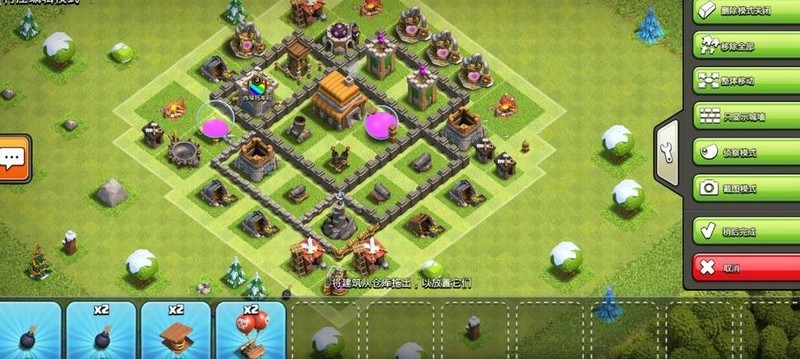 接着在周边设置防御,由于当前等级仅能建造箭塔和炮塔,为防范火箭筒覆盖不到区域的气球兵侵袭,我在防空薄弱处增设了箭塔,具体布局见图示。
