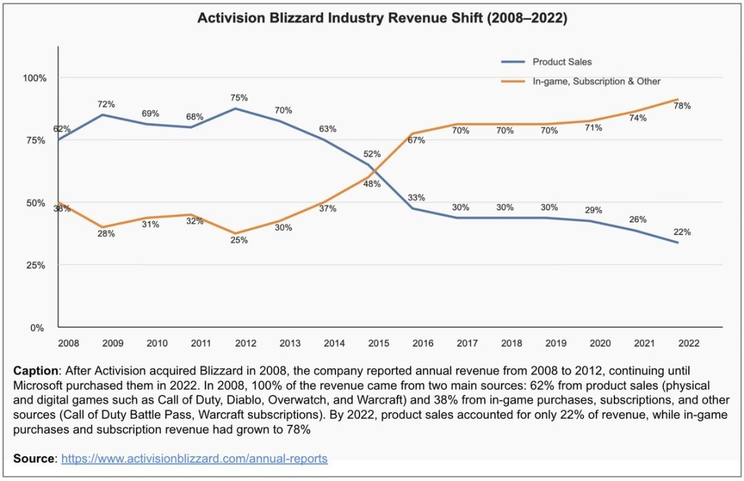 2008年公司合并初期,收入结构仍以实体与数字版游戏销售为主,两者合计约占总收入的62%,其余38%来自内购、订阅及其他服务性收入。此后数年,受多款主力作品热销推动,包括主机与PC平台的完整游戏销售占比一度在2009至2012年间提升至75%,显示出当时市场对一次性买断模式的高度依赖。