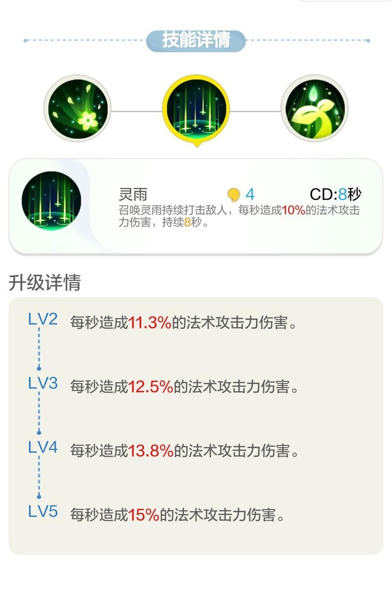 被动技能灵起风雨可在释放一技能时,有概率重置二技能的持续时间至8秒。
