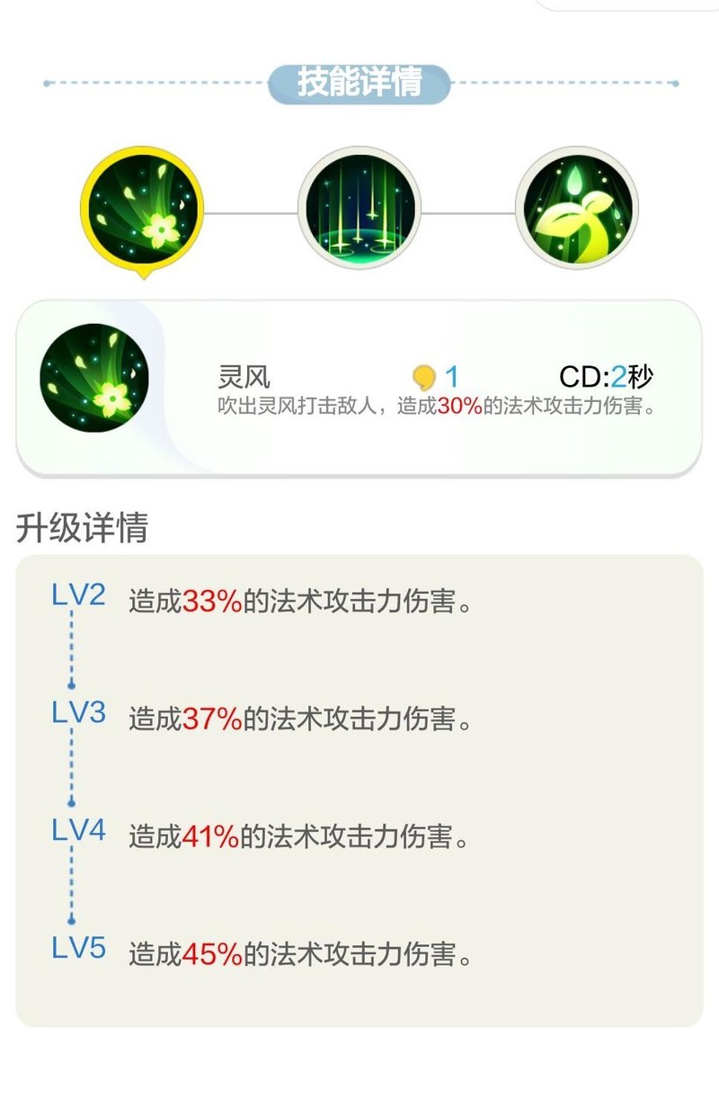 一技能灵风的伤害倍率较低,满级仅45%。相比之下,清明蝶的同技能为60%,香奴儿虽同为45%,却附带9秒禁锢效果。因此该技能在输出方面略显乏力,实用性受限。但其优势在于耗蓝少、冷却时间短,适合频繁释放,在特定场合仍有一定战术价值。