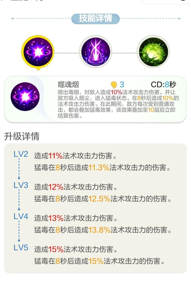 一技能噬魂烟可瞬间造成伤害,并为目标附加猛毒效果。每次普攻命中可叠加一层猛毒,叠满10层后爆发,每层额外造成15%的伤害。该技能机制较为特殊,是目前描述最复杂的技能之一。在满级状态下,总伤害最高可达皇甫公子法术攻击力的165%,输出能力尚可但并不突出。此外,技能释放前摇时间较长,影响实战手感与命中率,整体表现中规中矩,强度有限。