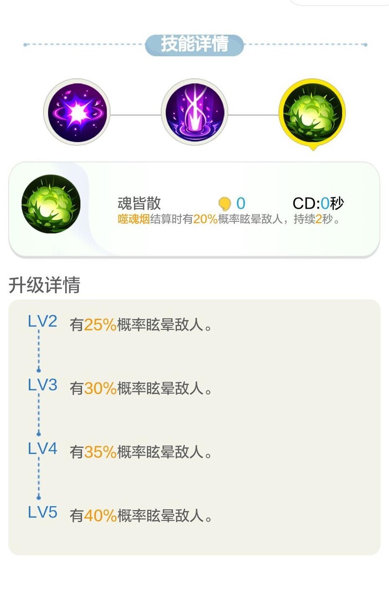 被动技能魂皆散在猛毒触发时有一定概率使对手眩晕,效果存在8秒延迟,且触发几率较低,整体强度偏弱。虽属于狐狸角色中少见的硬控技能之一,但稳定性差,眩晕持续时间短,实战中作用有限,更多是锦上添花,有无此技对整体影响不大。