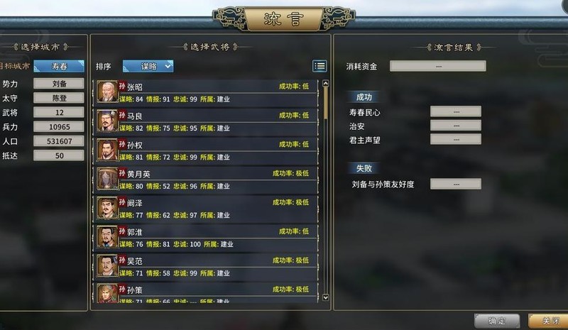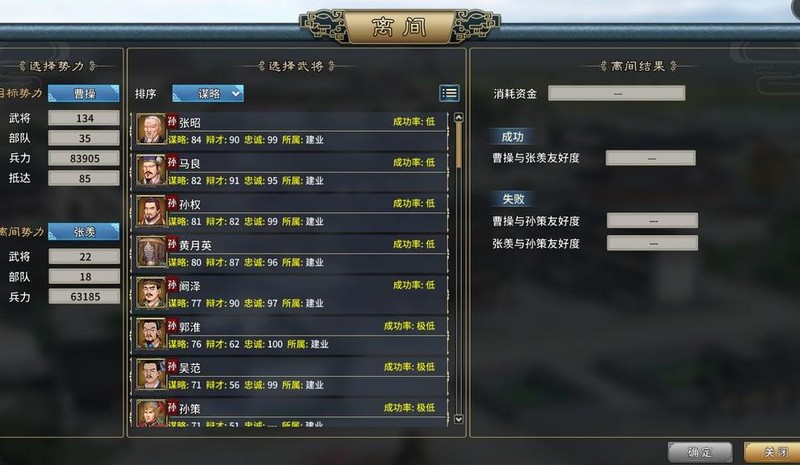 通过派遣擅长谋略与辩才的武将对两大势力实施离间计,可降低其彼此间的友好程度,促使其相互攻伐。若计策失败,则可能影响己方与其他势力的关系。在游戏初期,若拥有较多此类人才,合理运用离间之术,可借敌制敌,坐收渔利,逐步扩张自身实力。