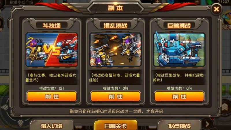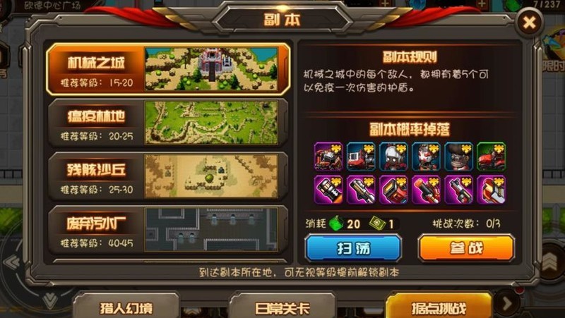 据点挑战即常规副本,目前共有六个,可获得战车与角色碎片。玩家可根据需求选择挑战,建议初期优先通关全部副本。每日每个副本可挑战三次,首次通关后可使用扫荡券直接完成,每次扫荡消耗20点体力,提升资源获取效率。