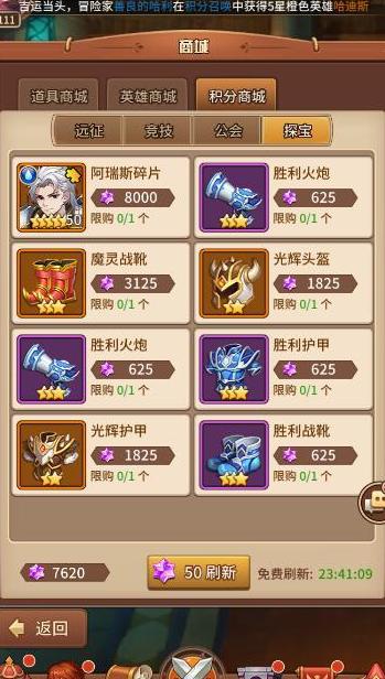 当积攒到一万多积分时,可开始每日查看探宝界面,耐心等待心仪英雄出现。所有英雄均有机会随机刷新,若积分达数万可考虑手动刷新,但不推荐。其余奖励物品不建议兑换,专注目标英雄即可。