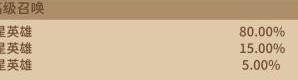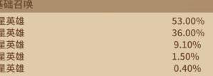 五星英雄概率为10%,碎片获取概率20%;四星英雄掉落概率70%。