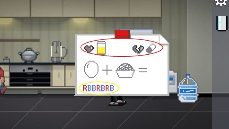 点击地面的桶装水完成饮水机安装,接着查看冰箱上便利贴获取线索:红圈标注柠檬水对应完整心形,白水对应缺角心形,中间为下关提示,黄圈标明饮水机密码。随后点击饮水机,按提示依次按下红蓝键红蓝蓝红蓝红蓝,最后将水杯拖至出水口接水即可。