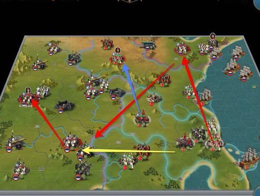 红色箭头表示主力部队行进方向,蓝色箭头为线列步兵突袭路线,黄色箭头是新组建部队的推进路径。